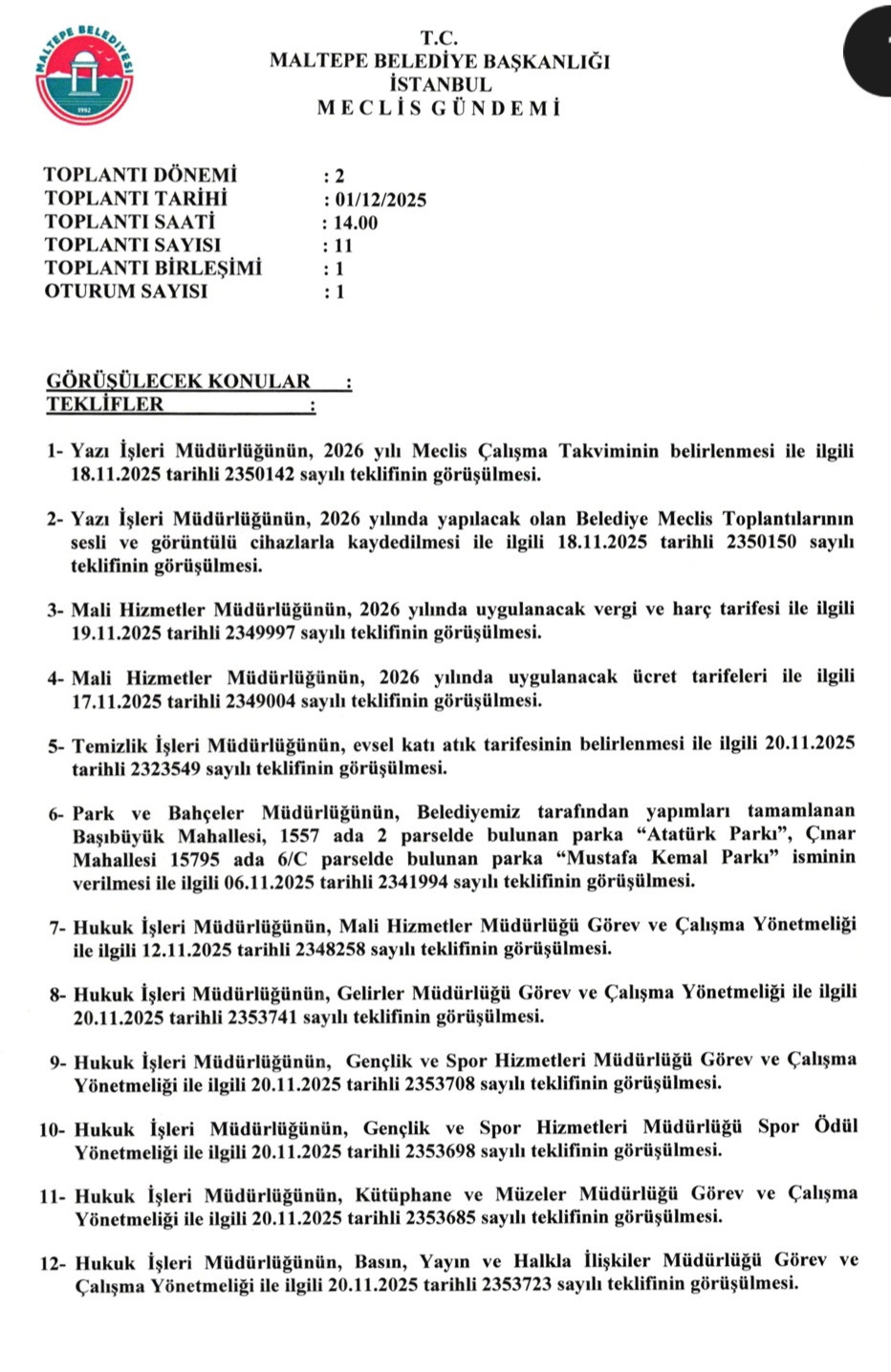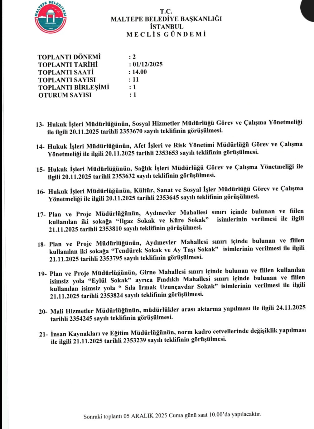 Maltepe Belediye meclisi aralık ayı toplantıları, 21 maddelik teklifle 1 Aralık pazartesi saat 10.00'da meclis salonunda ge4çekleşecek