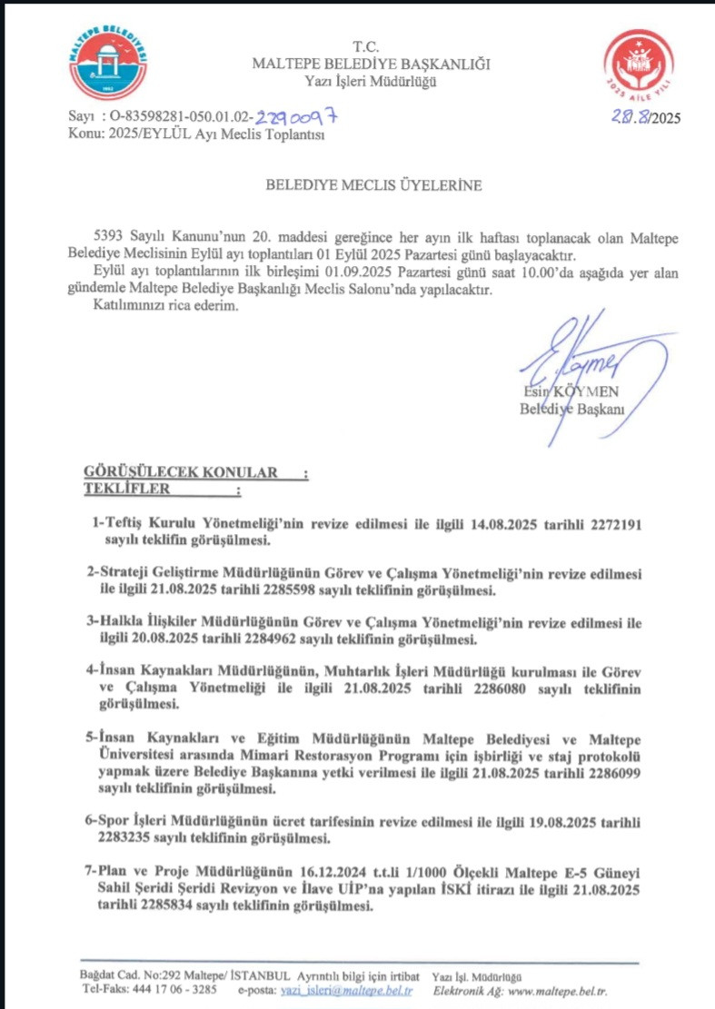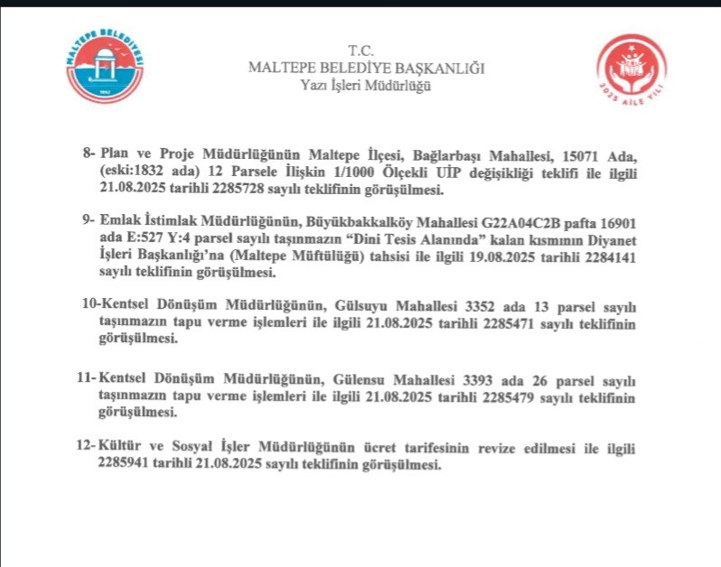 Maltepe belediye meclisi Eylül ayı toplantılarınin ilk oturumu 12 maddelik teklifle gercekleşecek